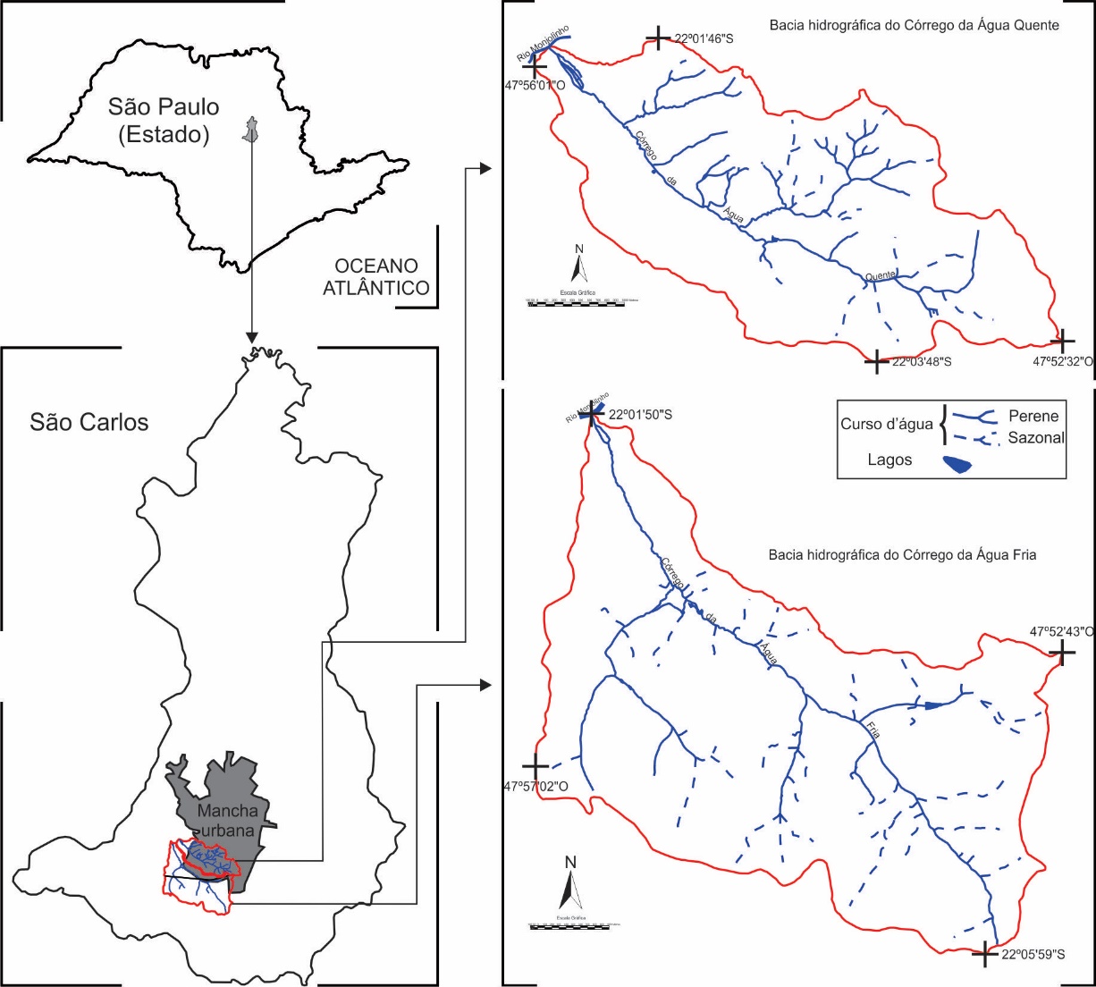 As bacias hidrográficas dos Córregos da Água Quente e da Água Fria estão localizadas no setor centro-leste do estado de São Paulo, no município de São Carlos (Figura 1), possuindo uma área de 12,6 km² e 28,8 km², respectivamente.