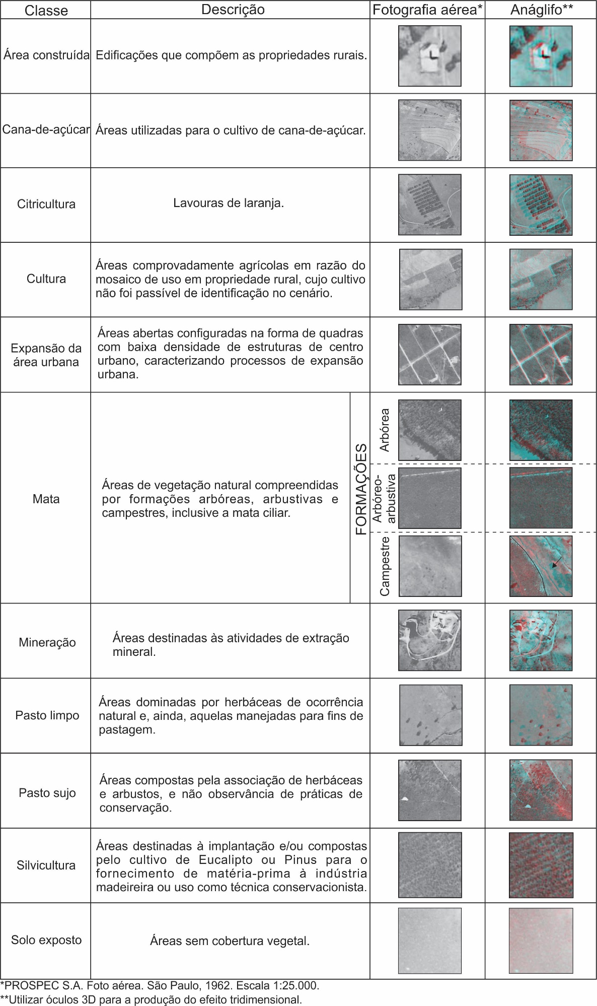A elaboração da carta de uso e cobertura da terra desses sistemas ambientais foi realizada no ambiente do software AutoCAD® 2016 por meio da fotointerpretação de imagens tridimensionais geradas pela técnica Anáglifo em meio digital do software livre StereoPhoto Maker, tendo como base de dados as fotografias aéreas do levantamento aerofotogramétrico mais antigo do município, datado de 1962, na escala de 1:25.000.