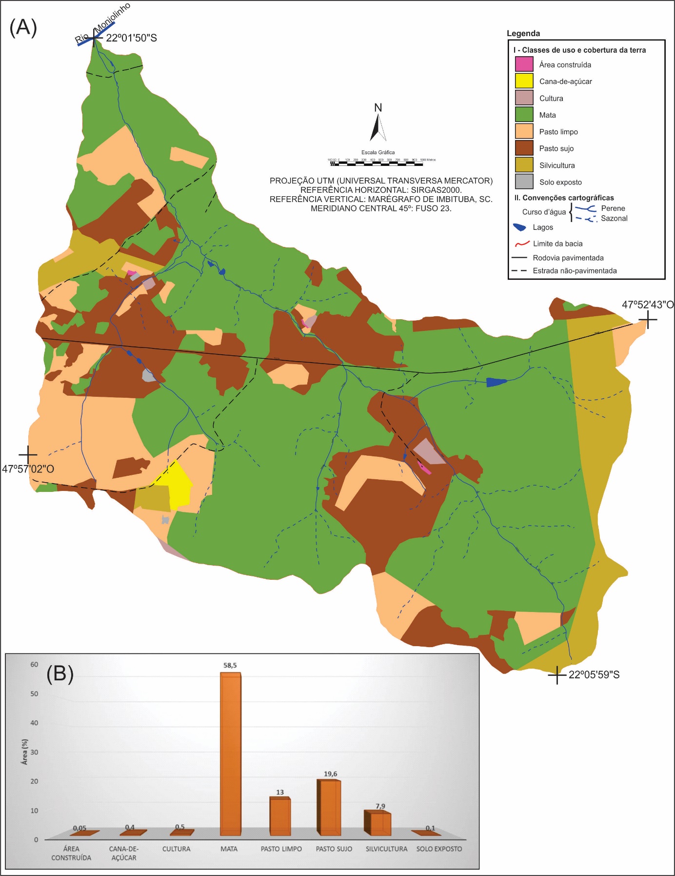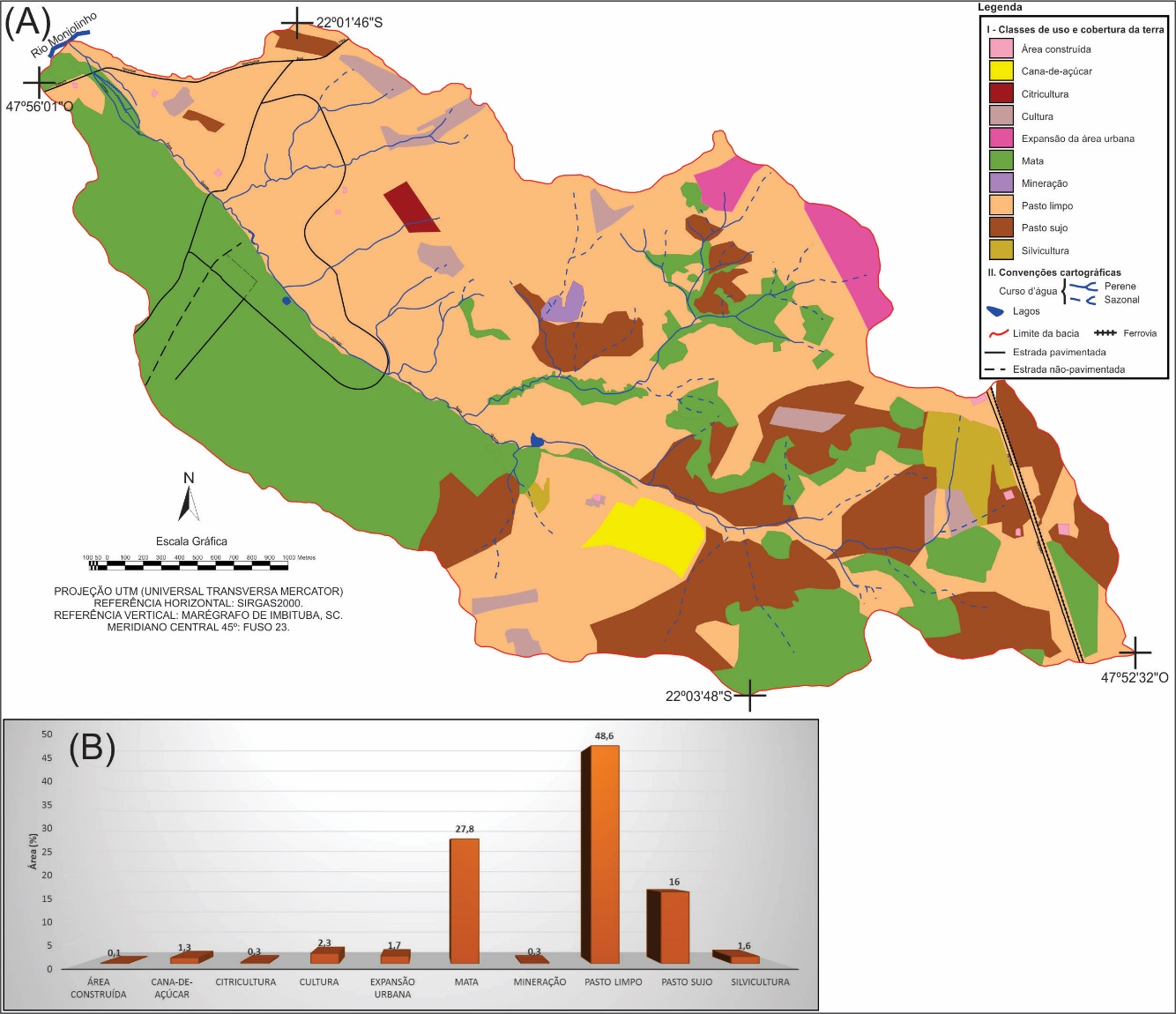 Ambas as bacias hidrográficas apresentaram um padrão de uso e cobertura da terra típico de paisagem rural. Apesar dos ensaios cartográficos realizados neste estudo não contemplarem as feições geomórficas dos sistemas ambientais, a distinção e o arranjo espacial de algumas classes de uso e cobertura da terra permitiram o reconhecimento de divergência entre esses sistemas quanto aos estágios de intervenção antrópica.