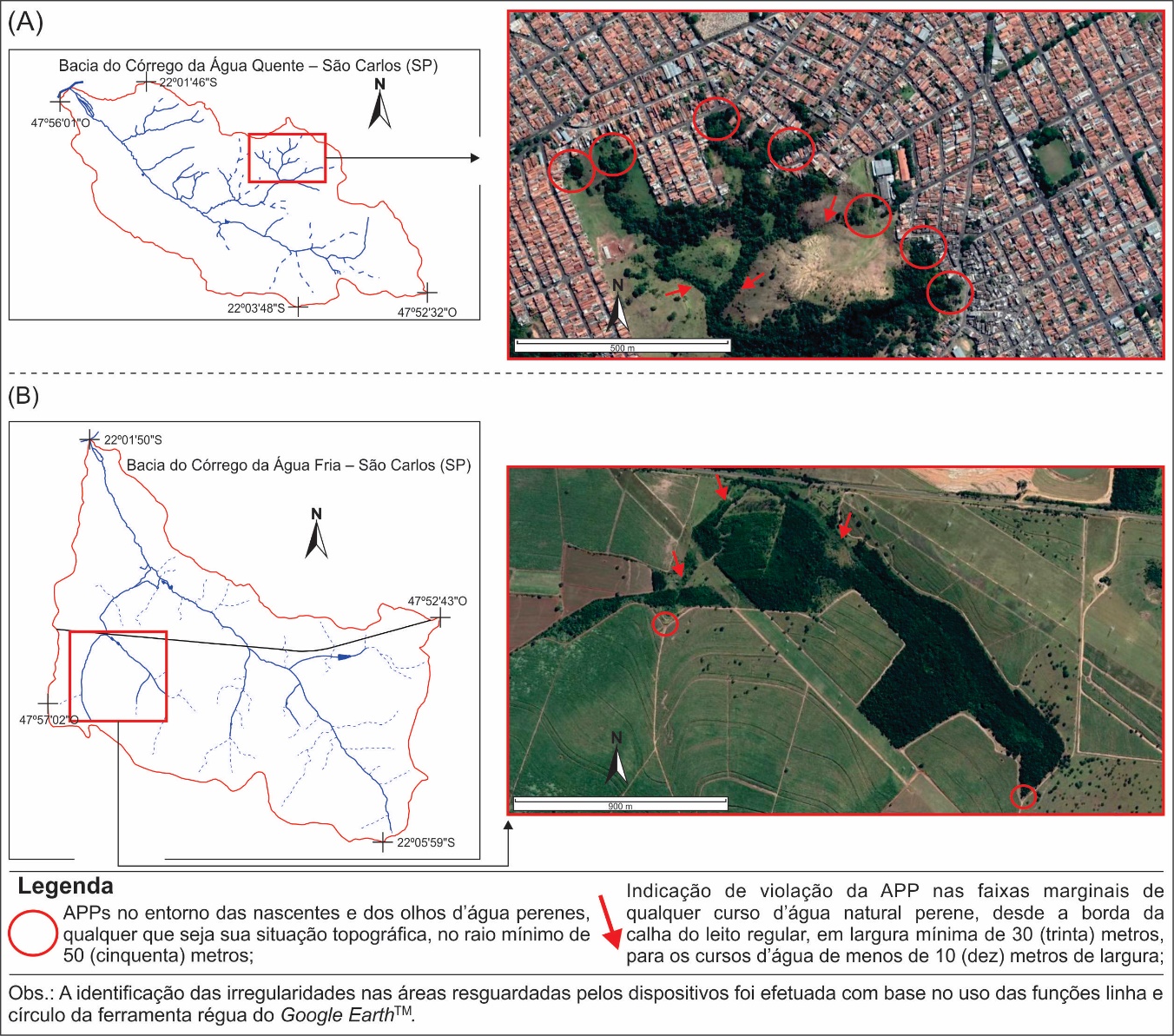 Além de fornecer indícios sobre a dinâmica do uso e cobertura da terra, a correlação entre os dados do cenário mapeado e a imagem do Google EarthTM demonstrou a constituição de um quadro de violações de dispositivos do Código Florestal vigente (BRASIL, 2012) em ambos os sistemas ambientais (Figura 5).
