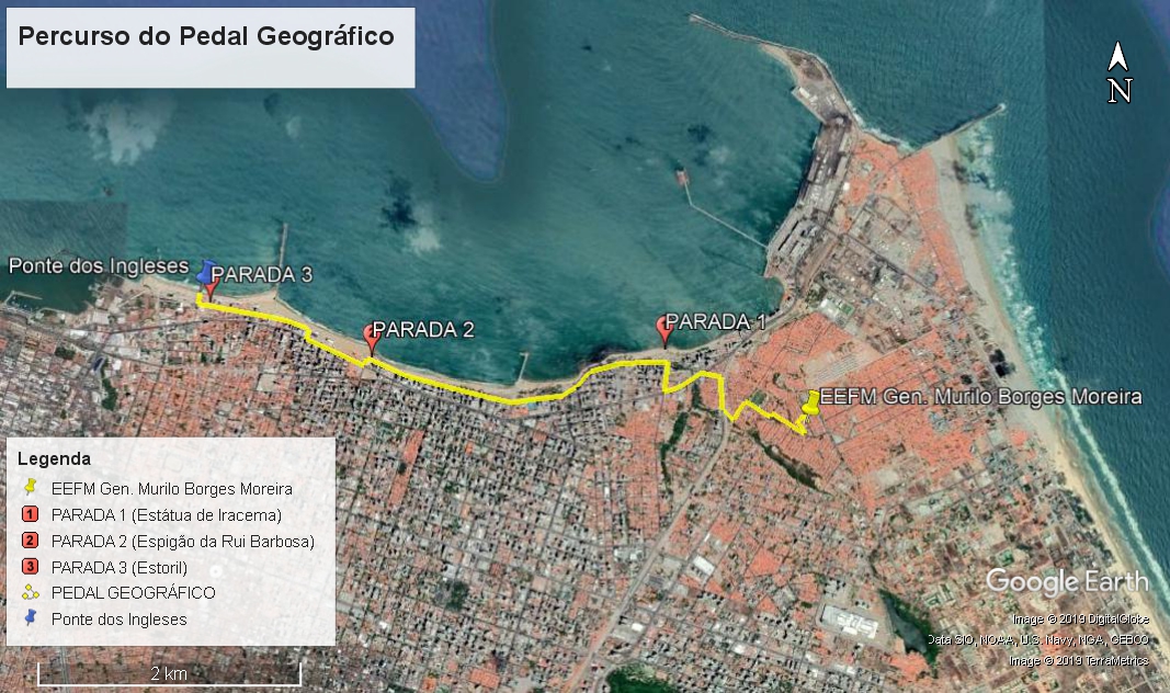 Fonte: Google Earth, adaptado pelo autor.A primeira parada ocorreu na Estátua de Iracema, localizada na Av. Beira Mar. Neste local os alunos foram orientados a perceberem a paisagem com ares de modernidade do local, levando-os a compreender que o processo de ocupação de Fortaleza ocorreu negando, inicialmente, as áreas litorâneas da cidade e privilegiando o sertão como região produtora da riqueza e da elite da capital (DANTAS, 2006).