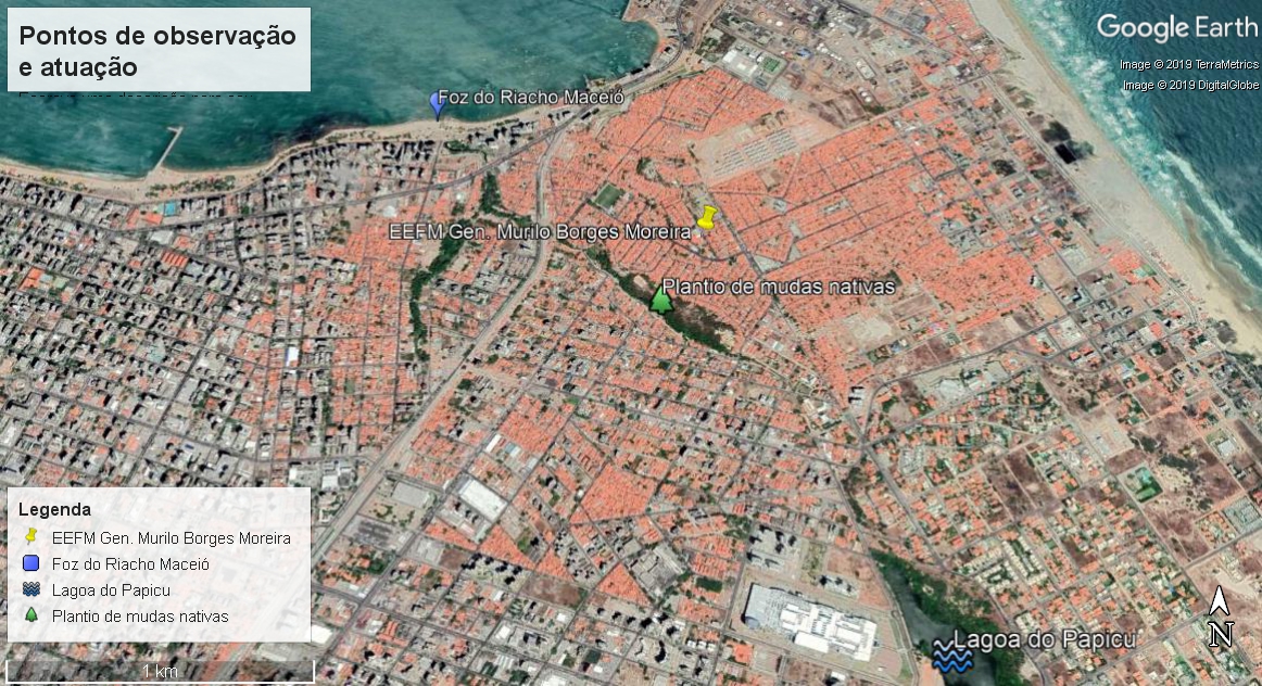 Nesta oportunidade, visitou-se a nascente do riacho Maceió (Lagoa do Papicu) e a sua foz, localizada na Avenida Beira Mar. Os pontos de interesse dessa atividade estão destacados na Figura 3. O objetivo desta atividade é estimular a ação conjunta e a capacidade de solucionar os problemas da área, desenvolvendo ao mesmo tempo o aprender a fazer e o aprender a ser.