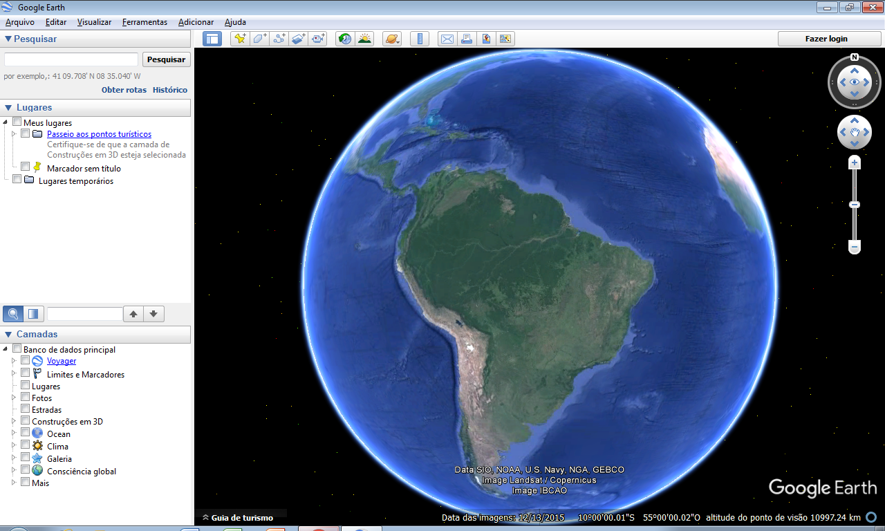 Ao acessar a plataforma (Figura 2), o usuário visualiza a janela principal com o default já padronizado, com destaque para as seguintes abas: na parte superior a barra de menu; na lateral esquerda há três painéis - pesquisar, lugares e camadas; e a imagem tridimensional da Terra com os controles de navegação. Abaixo da imagem, aparecem informações como: coordenadas geográficas, elevação e datas. A barra de menu apresenta as seguintes opções: arquivo, editar, visualizar, ferramentas, adicionar e ajuda. Com o mouse, é possível aproximar e afastar a imagem com facilidade. Ou seja, é um software bem intuitivo e de fácil interação.