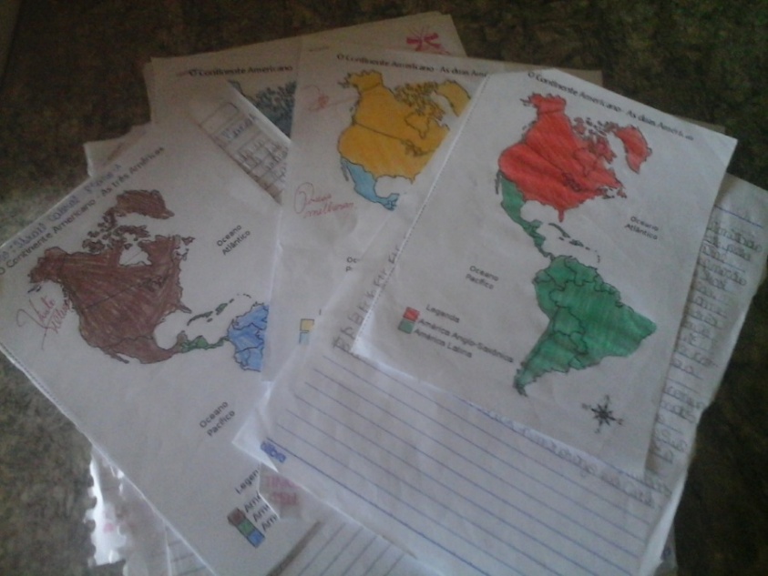 Para a consolidação aprendizagem, no dia na semana em que não era realizado o estágio, foi deixado sob orientação da professora supervisora o desenvolvimento de uma atividade de confecção de mapas, em que os discentes deveriam colorir os mapas, espacializando na representação cartográfica os dois tipos de regionalização do continente e, em seguida, a produção de textos explicativos de ambas (Figura 1). Assim, o estágio se deu sob a forma de auxílio mútuo, permitindo a troca de conhecimentos e experiências.