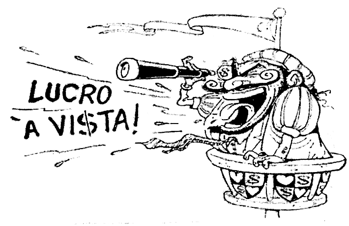 Pelo que entendi a charge quis mostrar um navegador dentro de um navio, e ele está gritando “Lucro a vista”. Ou seja, com certeza devia ser um terra fértil, cheio de riquezas e matéria-prima e seu pensamento com certeza seria de exportar e ganhar mais dinheiro, ou seja, lucro em cima do suor e cultura dos outros, Como foi o caso do Brasil, nosso pais .(Aluno A, 13)