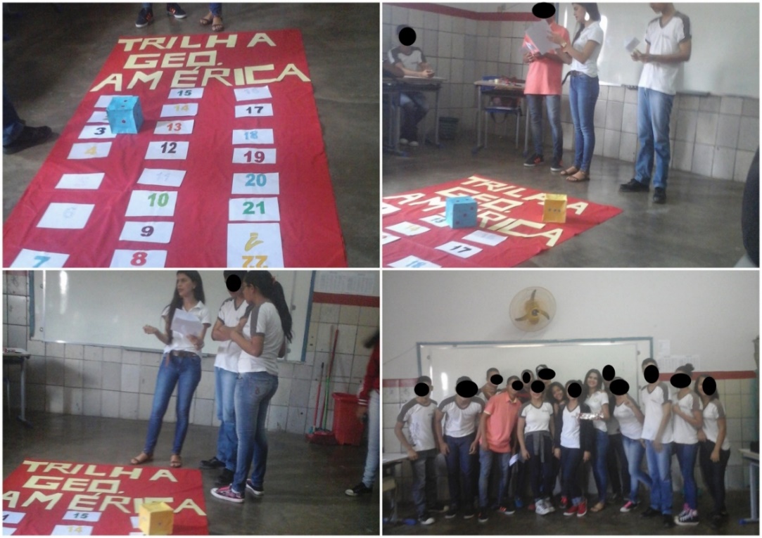 Por fim, foi realizado o jogo “Trilha Geográfica: Continente Americano”, composto por questões referentes aos conteúdos ministrados e dialogados com os discentes (Figura 5). Para a construção deste jogo, as questões não foram escolhidas aleatoriamente, de modo que o teor das questões se vinculou ao eixo central do projeto educacional, isto é, a compreensão da organização espacial do continente americano e, assim, permitissem a compreensão das diferenças entre a América Latina e Anglo-saxônica. Com isto, conforme fosse se desenvolvendo o jogo essa reflexão construída.