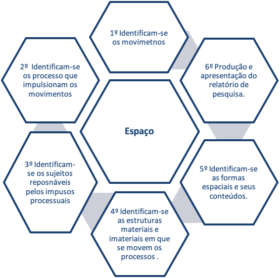 A observância dos passos da pesquisa é importante para facilitar a identificação das categorias espaciais, considerando que o ambiente escolar é, ao mesmo tempo, produto e produtor dos movimentos. Estes são impulsionados pelos processos que têm origem e duração determinadas pelos comandos emitidos pelos sujeitos, conforme sua posição na escala de poder. Sujeitos que nem sempre têm suas bases de decisão no espaço local, mas estão distantes do ambiente escolar e são quase imperceptíveis, já que se manifestam por meio de terceiros, porém, com forte poder de interferência nos processos que produzem o dia a dia da escola.