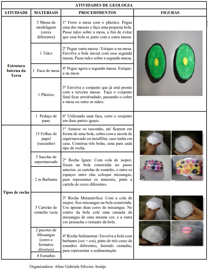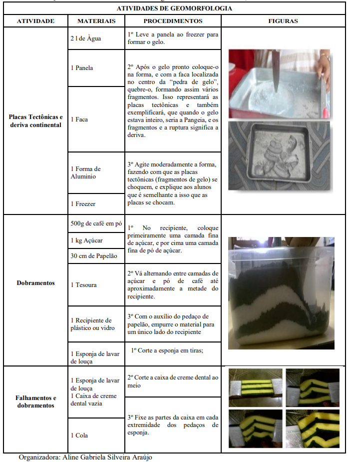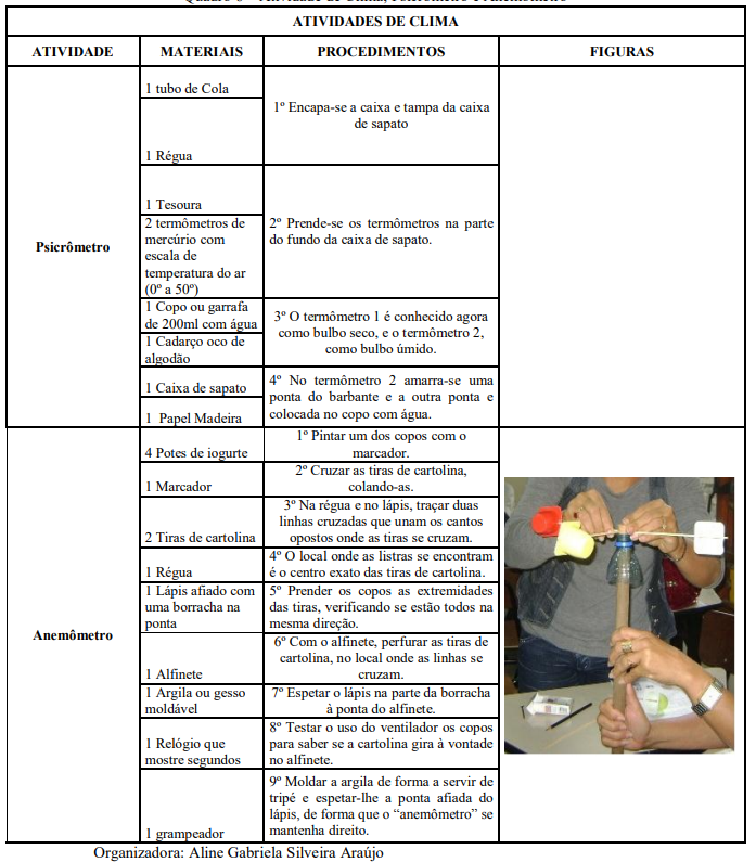Abstract: The article presents methodological proposals to work on subjects related to Physical Geography in the classroom, aiming that this area of geographic science be seen in a more accessible and related to the daily life of students. The work is the result of activities developed in the Institutional Scholarship Program for Scientific Initiation (PIBIC). The methodological procedures began with the bibliographical survey, followed by analysis of two didactic books and later the execution of the experiments and equipment on the subjects worked. It was thought of a didactic as well as a sustainable approach, since the handmade instruments were constructed with materials recycled and / or of easy access, like materials that the student owns in his domestic environment. The research proved that it is possible to work Physical Geography in an interesting and enjoyable way, bringing the content of the textbook to the reality of the students, making it possible for them to understand more clearly the natural dynamics of the geographic space.