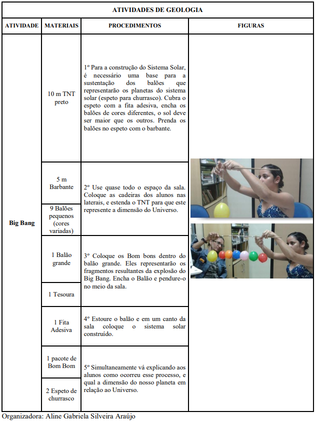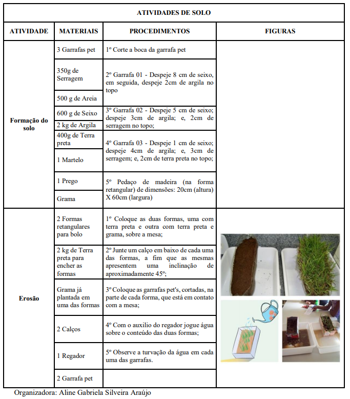 Em relação ao segundo objetivo, que trata da elaboração de experiências relacionadas ao ensino da Geografia Física, além das preocupações citadas no objetivo anterior, exigiu uma maior atenção, por se tratar de experiências que devem ser realizadas em sala de aula, na presença dos alunos. Desse modo, foi necessário pensar nos materiais utilizados, pois sexto ano do ensino fundamental é composto por crianças, e no tempo de execução da atividade, uma vez que em média, o professor tem pouco tempo de aula e para o sucesso do uso de atividades práticas durante as aulas, faz-se necessário que estas estejam associadas a boas explicações tanto quanto a sua execução, quanto ao assunto que está relacionado.