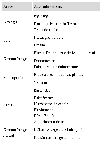 As atividades práticas foram pensadas com o intuito de auxiliar as aulas que envolvam conteúdos físicos da Geografia, por esse motivo, estas se dividem em ramos da ciência geográfica, conforme Quadro 1: