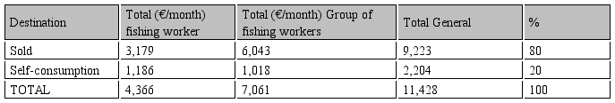 To get an approximation of the real income from artisanal fishing, three scenarios are assumed: 1) if fishing workers sell 100% of their catch, total direct earnings are € 37,672.94; 2) if they sell 50% of their catch, total direct earnings are € 18,836.47; and 3) if they sell 25% of their catch, total direct earnings are € 9,418.24.