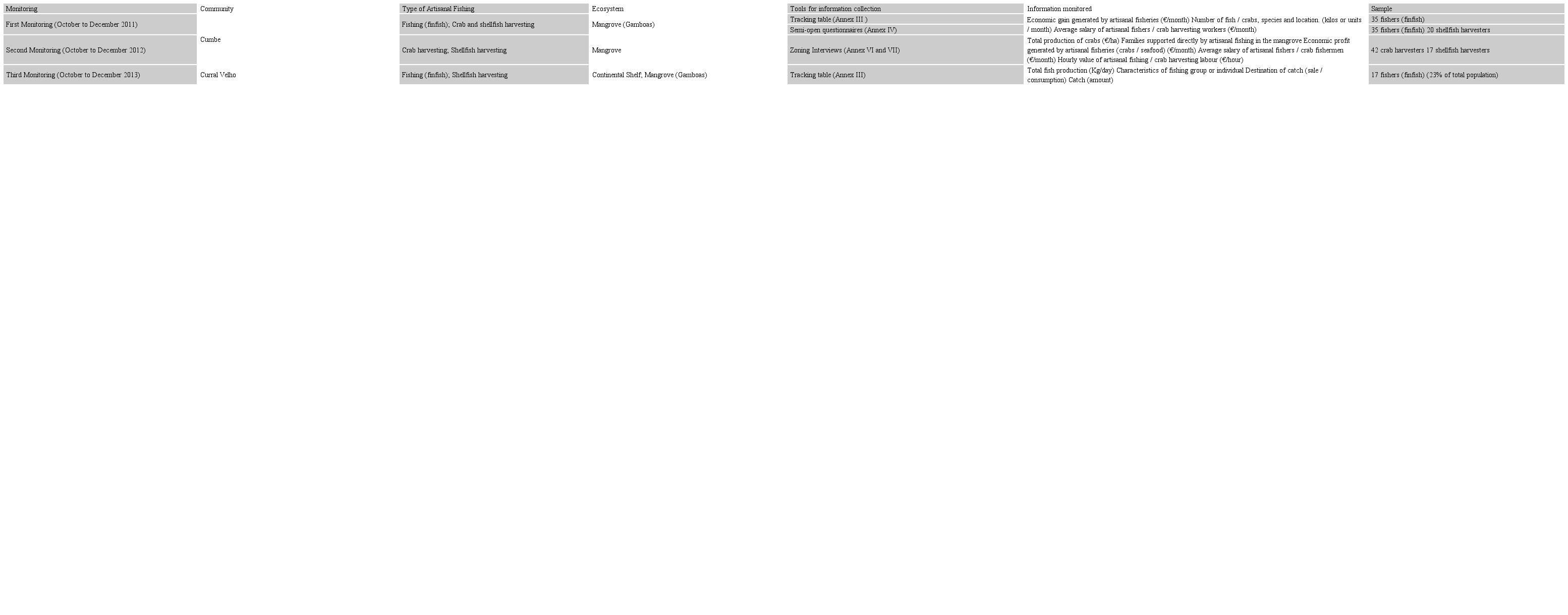 The semi-open questionnaires were filled in by 35 fish and crab catchers (81% of the total) and 20 shellfish collectors (74% of the total). The total sum earned by fishing workers in Cumbe, considering artisanal fishing of crabs, fish and shellfish, was found to be € 103,438 / year, i.e. € 8,619 / month. The results of the second monitoring in Cumbe showed that the value of a well-preserved hectare of mangrove from the production of crabs is € 0.71 / m. / year, i.e. € 7,120 / ha / year. This value was obtained from measurements of mangrove productivity in three separate areas of study in the community.