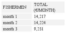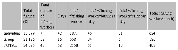 Table 8 shows more accurately the benefit to each individual or group of fishing workers per working day. On average, over a period of three months, individual fishers worked 42 days to earn € 1,871, which means receiving € 624 / month (€ 45 / hour). Fishers working in groups worked 16 days to earn € 558, which is € 186 / month (€ 34 /hour).