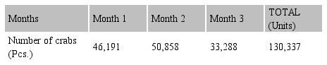 Table 4 shows the quantities of fish and crabs caught in the 3 months by the same group of fishing workers (35 in total). A total of 130,337 crabs (43,445 pcs./month) and 1,931 kg of fish (643 kg/month) were caught within the 3 months of the investigation.