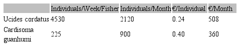 The data in Table 6 show that on average, each crab collector can earn a salary of € 508 / month (Ucides cordatus) and 360 €/month (Cardisoma guanhumi). On average, Ucides cordatus harvesters worked 5 hours a day for 4.6 days a week, working 23 hours / week (€ 127.20 / week or € 5.53 / hour of work).