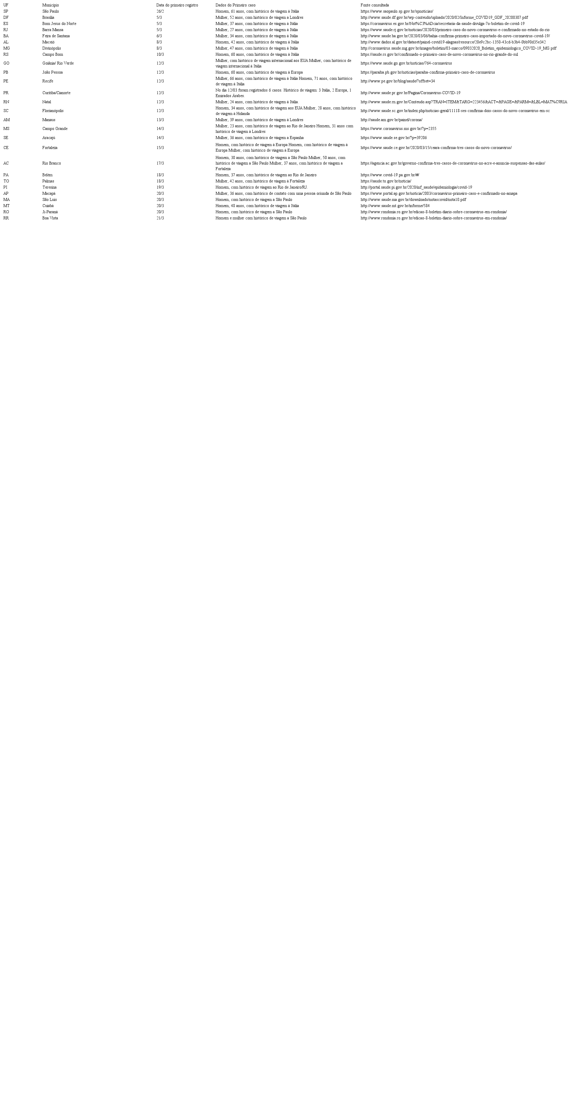 No tocante ao levantamento do histórico recente de viagem das primeiras pessoas que testaram positivo para a COVID-19 em cada estado brasileiro, cabe ressaltar que em alguns casos não foi possível a identificação exata do país visitado, uma vez que a informação disponível se referia apenas ao continente. Para alguns estados, foi possível obter informações mais detalhadas, como por exemplo sexo e idade dos primeiros indivíduos com testes positivos para o vírus. No Quadro 2 é possível visualizar uma síntese sobre os primeiros casos de COVID-19 confirmados em cada estado brasileiro, com informações de UF/Município, data de registro, entre outras. Cabe ressaltar que, para alguns estados, devido à confirmação de vários casos, não foi possível selecionar o primeiro caso, na data de referência.