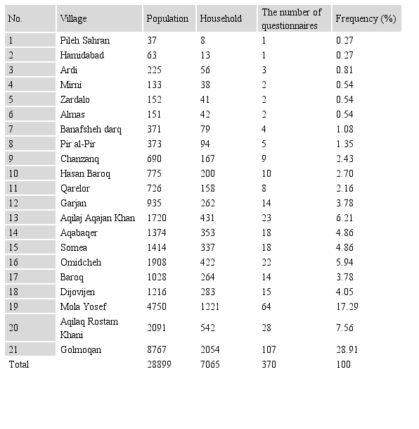 According to the available statistics, the number of villages in the central part of Ardabil is 41 villages. Therefore, according to the objectives and hypotheses of the study, the stratified (multi-stage) method was used. In this method, the number of households is used to determine the sample size of the villages. According to this criterion, the villages were selected as shown in Table 1; after determining the number of households, the villages in the area based on the number of households in 2016 were divided into 8 categories. Then, in order to determine the selected villages from each population category, one high populated and one low populated village was selected. Then, in order to determine the sample villages, the size of the households was studied, so the sample size of households was determined based on Cochran formula, which equaled 370 households. In the following, household questionnaires were distributed among the studied villages in terms of population and number of households as shown in Table 1.