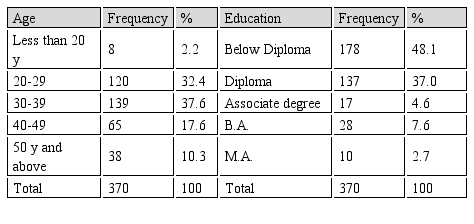 In the present study, among 370 rural respondents who responded to the questionnaires of 5 age groups, the highest frequency was in the age group of 30-39 years with 139 respondents, comprising 37.6% of total respondents. The lowest frequency was for 8 respondents with less than 20 years, which was 2.2% of respondents. In terms of education, among 5 educational levels, the highest frequency was observed among 178 respondents and 48.1% of the respondents were below the diploma level. Also, the lowest frequency was for postgraduate education with 10 respondents (2.7%) (Table 2).