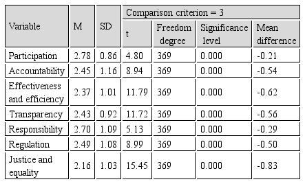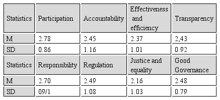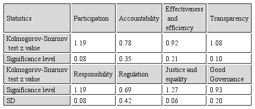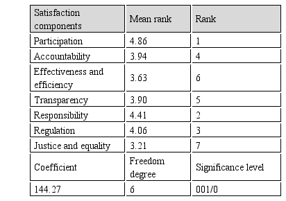 According to the results of Table 3, the mean participation was 2.78, accountability 2.45, effectiveness and efficiency 2.37, transparency 2.43, accountability 2.70, regulation 2.49, justice and equality 2.16, and good governance 2.48. The highest mean belonged to the index of participation and the lowest mean was for the index of justice and equality.