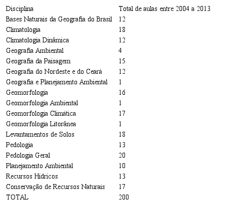 Com o intuito de realizar um levantamento histórico a respeito das aulas de campo que ocorreram no curso de Geografia da UFC, foi realizada uma catalogação dessa atividade praticadas nos últimos 10 anos, levando em consideração os totais das aulas por disciplinas. Com o objetivo de catalogar de forma organizada foram separadas as disciplinas pelos eixos temáticos em que as mesmas se enquadram. Os eixos temáticos são: Geografia da Natureza, Estudos de Geografia Rural e Urbana, Geografia e Ensino, ou Geografia Instrumental e Metodológica (conforme os Quadros 1, 2, 3 e 4).