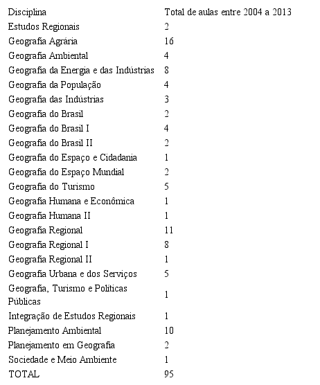 - O Eixo Temático Geografia Rural e Urbana, registrou 95 aulas, concentradas nas disciplinas Geografia Agrária, Geografia Regional, Conservação dos Recursos Naturais e Planejamento Ambiental. Estas disciplinas é de fundamental importância o campo, pois através do observar como essas áreas foram ocupadas e como as políticas regional e local atuam, dando a oportunidade de se entender os problemas e começar desenvolver mecanismo metal de como seria possível sugerir propostas que possam viabilizar melhorias a área em questão.