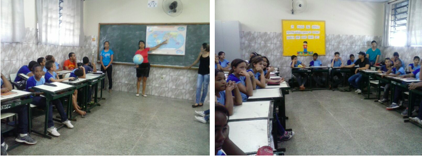 Os principais procedimentos utilizados (Figura 2) foram: aula expositiva e dialogada com desenvolvimento de atividades lúdicas1, possibilitando os acadêmicos realizarem uma avaliação através da observação do desempenho e da dialogicidade dentro da sala de aula, a participação e o desenvolvimento cognitivo dos alunos em relação ao conteúdo, nesta perspectiva utilizou-se de material teórico o livro; Ensino de Geografia: práticas e textualizações no cotidiano, organização de Antonio Castrogiovanni, Helena Callai e Nestor Kaercher (2012) através de uma abordagem metodológica Paulo Freiriana. Cabendo ao estagiário o desenvolvimento de técnicas que possam auxiliá-lo na sua prática docente em sala de aula através de diálogos com orientação do professor supervisor, deste modo, como menciona Castrogiovanni (2007) o processo como esse possibilita a reflexão do acadêmico em relação à realidade que está posta e vivenciada.