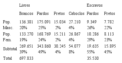 Merece nota o percentual de “caboclos” em torno de 8%. Um indício da diferença ainda que o período marque a difusão da ideia do “desaparecimento indígena” na província, discurso que se ancora em documentos oficiais que tratavam de aldeamentos, circunscrições em que um ou mais povos indígenas eram colocadas sob a administração colonial, quadro que marca a maioria dos grupos atuais.