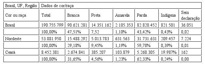 Se no Brasil temos 50,94% de negros, na região Nordeste este percentual é de 69,23% e no Ceará é de 66,89%. Como se pode verificar no apêndice, este número fica em 62,28% em Fortaleza e 64,61% na região metropolitana da capital. O percentual de indígenas no estado fica abaixo de média nacional e regional, mas em números absolutos é significativa a quantidade de indivíduos que se afirmaram indígenas no questionário básico do IBGE: cerca de 20 mil.
