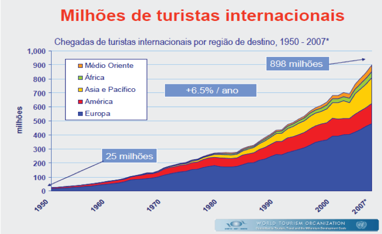 Podemos observar no Gráfico 1, as etapas dos fluxos mundiais desde 1950 até os anos de 2007. Os principais índices de crescimento atrelam-se à lógica dos anos 1990-2000 com a abertura internacional de um grupo de economias menos desenvolvidas reforçadas com o discurso político-econômico-financeiro bipolarizado que reinava até o final dos anos 1990. São dados relevantes para a compreensão da espacialização dos fluxos turísticos. Apesar da predominância dos fluxos europeus, vê-se nitidamente a ampliação dos fluxos pela América (que deve ser relativizado pela presença de América do Norte com EUA e Canadá), Ásia e Pacífico.