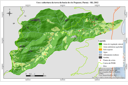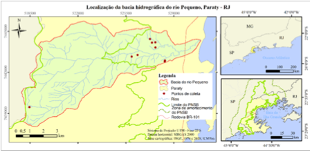 A área de estudo compreende a bacia hidrográfica do rio Pequeno – BHRP, localizada no município de Paraty, litoral sul fluminense, no Estado do Rio de Janeiro (Figura 1). A bacia está inserida no Parque Nacional da Serra da Bocaina – PNSB e sua zona de amortecimento, UC criada por Decreto Federal em 1971 e posteriormente modificada pelo Decreto Federal de 1972, abrangendo uma área de 104.000 hectares (BRASIL, 2002).
