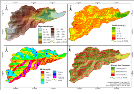 O PNSB ocupa 36 km² da BHRP, ou seja, 76% da área de estudo. Desse total de 36 km², 68% possui declividade entre 20-45° e outros 28% entre 8-20°, sendo um dos fatores relevantes na delimitação da área do Parque, indicando fortes restrições ao uso do solo e alta suscetibilidade aos processos morfogenéticos (GUERRA et al., 2017;ROSS e FIERZ, 2018). As classes com predomínio de declividades acentuadas também foram encontradas em outras bacias hidrográficas sobre a Serra da Bocaina, a exemplo do trabalho de Neves (2015) na bacia do rio Mateus Nunes em Paraty – RJ.
