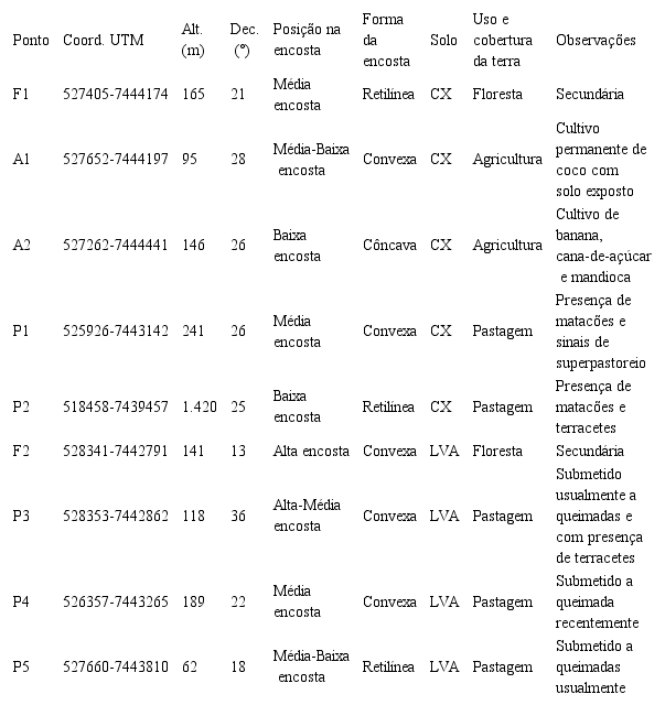 Nesse sentido, não foi possível acessar certas áreas da bacia, então, as coletas ficaram concentradas na zona de amortecimento (Figura 1). As coletas foram feitas na camada superficial do solo, nas profundidades de 0-10 cm e 10-20 cm, onde se observa maior influência das atividades humanas sobre propriedades do solo fundamentais para sua resistência à erosão (BRADY e WEIL, 2008;PEREIRA e THOMAZ, 2015; PEREIRA et al., 2016). Em cada ponto foram coletadas três amostras em anéis de Kopeck de 100 cm³, visando determinar a densidade do solo – Ds, densidade de partículas – Dp e porosidade total – Pt, e uma deformada, utilizada para determinar granulometria, pH e matéria orgânica – MO, ambas nas duas profundidades. Além disso, coletou-se um bloco indeformado na profundidade de 0-10 cm para verificar a estabilidade de agregados por via úmida. As características ambientais mais relevantes de cada pondo foram sistematizadas na Figura 2.