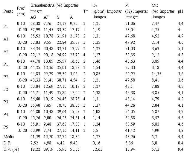 O ponto P2 apresentou o resultado mais baixo de Ds na profundidade de 0-10 cm e, consequentemente, a maior Pt. Porém, esses valores diminuem significativamente na profundidade de 10-20 cm. Acredita-se que por se tratar de uma área de pastagem com presença de terracetes, elevada altitude e temperaturas mais baixas, tenha favorecido o acúmulo de MO no topo do solo, reduzindo os efeitos do pisoteio do gado e diminuindo a compactação na camada superficial (BRADY e WEIL, 2008; GUERRA, 2013).
