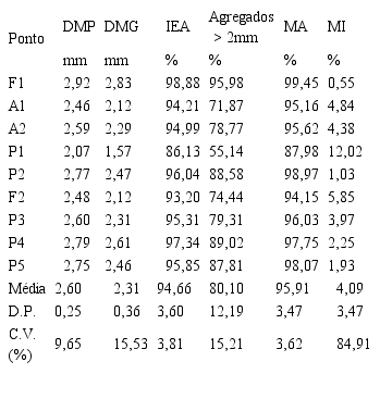 DMP: Diâmetro Médio Ponderado; DMG: Diâmetro Médio Geométrico; IEA: Índice de Estabilidade dos Agregados; MA: Macroagregados; MI: Microagregados; D.P.: desvio padrão; C.V.: coeficiente de variação.