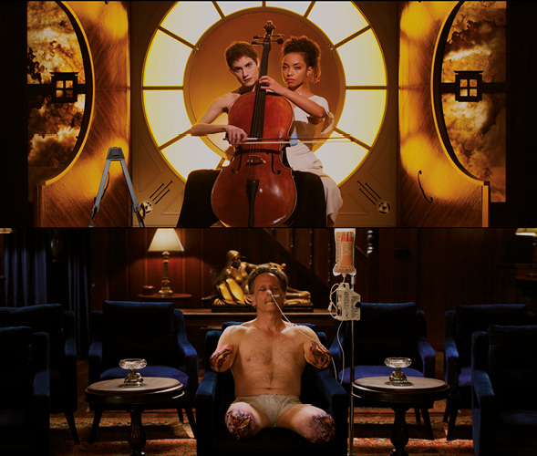 In the final scene of the film, the neo-liberal rhetoric highlights extremely inhumane behavioural codes, followed by the ominous visual setting and arbitrary kinaesthetic gestures.16 Furthermore, the musical “execution” of Charlotte and Lizzie in the Chapel is completely simulated, i.e., inaudible, and acoustically replaced by the electronic song “Petals”. Each of the lovers is now missing a hand, while Anton, with his mouth and eyes sewn shut and his limbs amputated, is forced to listen to them.