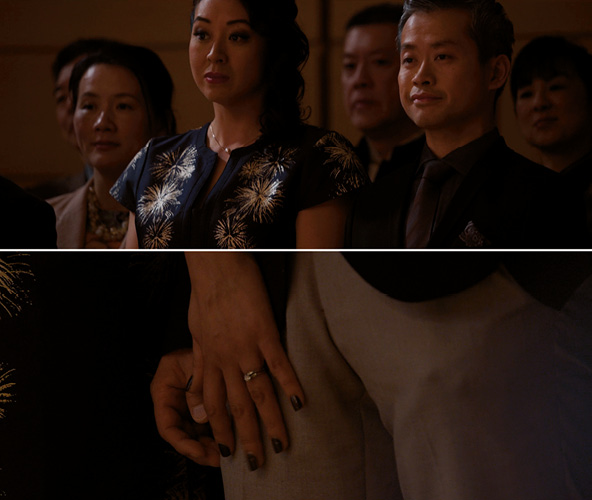 In particular, Casadesus’ “Cello Concerto in C minor” [00:08:24-00:11:03] is played simultaneously by three young cellists, while Lizzie and Charlotte, engrossed in their vulgar dialogic exchanges, participate only half-heartedly in the perceptual activity. They are too quick to predict the “results” of the so-called competition and immediately decide not to engage in holistic listening. The two parents, on the other hand, seem to have no interest in their daughters’ performance and prefer to focus on their own forbidden romance. Even more intriguing is that they do not try to hide their uncontrollable sexual urges from their spouses who are standing next to them.