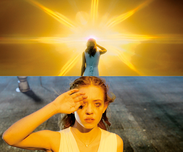 Obviously affected by Vivian’s discouraging words, Julie suffers a panic attack while on stage and runs away from the crowded audience. Her recently acquired piano skills have ultimately proven ineffective, revealing her inhability to translate them into practical application. The film viewer, on the other hand, can perceive how distorted electronic fragments of the “Devil’s Trill Sonata” sonically underpin her transgressive musical behaviour [1:24:51-1:25:24]. These heterogeneous hybrid sounds, synaesthetically paired with a devilish yellow light, eerily lead Julie to the roof of the auditorium. The shifting narrative perspective resembles a metadiegetic space, or even an internal diegetic space,24 as the audience sees Julie’s world accompanied by distorted visual imagery, almost like the blurred cinematic in-between universe of phantasmatic illusion, dream and reality. Particularly striking is the reappearance of the diegetically displaced sounds of Saint-Saëns’ concerto [1:25-24-1:26:08, 1:26:18-1:26:44] immediately following the electronic arrangement of Tartini’s sonata. Immersivity both sonically and visually contemplates the defeated dehumanised entity through the transformative liminal space,25 while this narrative ambiguity highlights Julie’s fatalistic self-transgression.