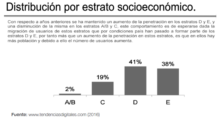 En la explicación del gráfico, se establece que existió un aumento en la penetración de los estrados Dy E, es decir, las clases sociales más pobres, pero lo importante es recalcar que este aumento no se debe a que estas clases sociales tengan un mayor poder adquisitivo, sino que por el contrario se debe, a que muchos usuarios de internet debido a las condiciones del país han migrado hacia estos estratos.