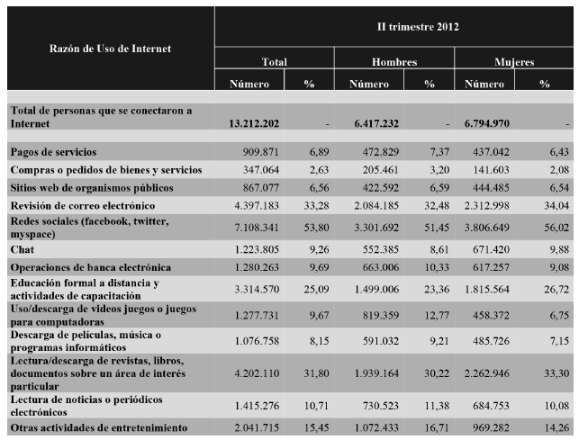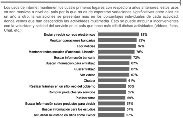De acuerdo a la información suministrada en el cuadro anterior, el mayor porcentaje del uso que las personas dan al internet en el país, se relaciona con actividades de ocio, particularmente uso de correo electrónico, actividades de entretenimiento, revisión de redes sociales y otras actividades como pago de servicios públicos, acceso a organismos públicos, compras de bienes y servicios, muy pocos lo utilizan para adquirir conocimientos y ninguno a la fecha del estudio refirió utilizarlo para laborar.