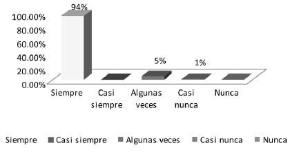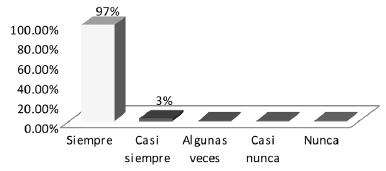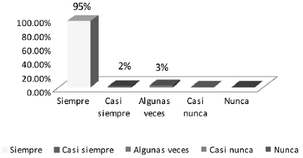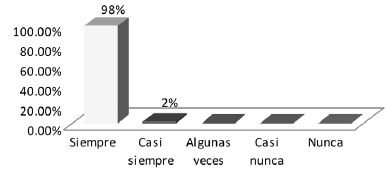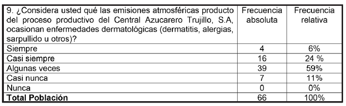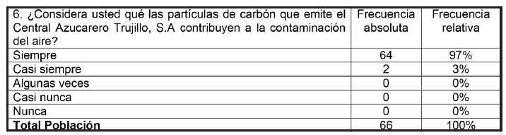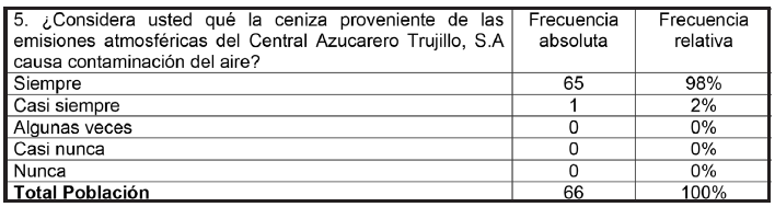 El 98% de la población encuestada considera, que siempre se produce contaminación en el aire por la ceniza proveniente de las emisiones atmosféricas del Central Azucarero Trujillo, S.A, y un 2% coincide en que casi siempre se produce contaminación en el aire por la ceniza proveniente de la entidad. Estos resultados pueden representar un problema para la entidad porque se evidencia que la comunidad puede estar siendo afectada por las emisiones atmosféricas provenientes del Central Azucarero Trujillo, S.A., aspecto sustentado por Morales (2011), al señalar que los procesos productivos de los centrales azucareros emiten a la atmósfera partículas contaminantes.