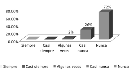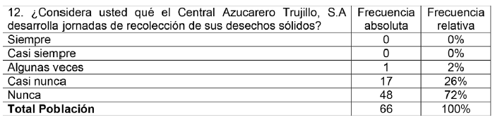 De acuerdo con los resultados obtenidos el 72% de la población considera que el Central Azucarero Trujillo, S.A nunca realiza jornadas de recolección de desechos sólidos, de igual forma un 26% señala que casi nunca se realizan dichas jornadas y un 2% de la población cree que algunas veces el Central Azucarero Trujillo, S.A realiza jornadas de recolección de desechos sólidos.