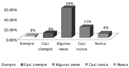 Sobre la base de los resultados obtenidos, un 59% de la población considera que algunas veces se han visto afectados por enfermedades como amibiasis, dengue y diarrea, las cuales asocian con los residuos sólidos que se generan en el Central Azucarero Trujillo, S.A; sin embargo un 21% casi nunca relaciona este tipo de enfermedades con los residuos sólidos de la entidad y un 8% opina que nunca han padecido enfermedades de este tipo. Cabe señalar que, un 9% de la comunidad encuestada considera que casi siempre han padecido enfermedades como amibiasis, dengue y diarrea por los residuos sólidos del Central Azucarero Trujillo, S.A y un 3% respondieron que siempre se han visto afectados por estas enfermedades. De los resultados obtenidos se podría señalar que gran parte de la población se ha visto afectada con menos frecuencia por enfermedades relacionadas con los residuos sólidos generados de los procesos productivos del Central.