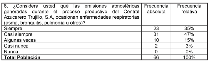 Datos tomados de la tabla 8 (2016)De los resultados obtenidos, un 47% de la población considera que siempre las emisiones atmosféricas generadas por el Central Azucarero Trujillo, S.A ocasionan enfermedades respiratorias; así mismo un 35% asocia estas enfermedades con las emisiones atmosféricas que resultan del proceso productivo de la entidad.