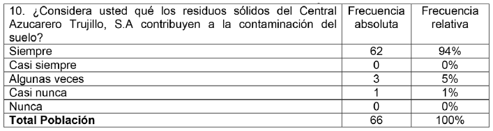 El 94% de la población considera que los residuos sólidos del Central Azucarero Trujillo, S.A siempre contribuyen a la contaminación del suelo, pudiendo perjudicar la fertilidad de la tierra, y como consecuencia provocar problemas de salubridad afectando la flora, fauna y la salud humana; tal cual como lo afirma Morales (2011), al mencionar que los desechos de las industrias azucareras propician contaminación por medio de vinazas y cachazas, afectando la fertilidad de las tierras, adicionalmente, Mayorga (2016) opina que además de estos residuos, también se generan el bagazo y la melaza