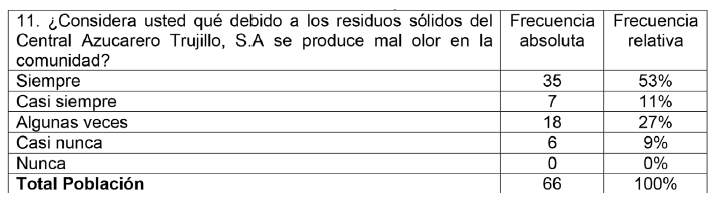 Por otro lado, un 27% de la población cree que algunas veces se produce mal olor causado por estos residuos y sólo un 9% de la población considera que casi nunca se produce mal olor por los residuos sólidos del Central Azucarero Trujillo, S.A.
