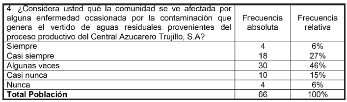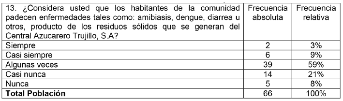 El 46% de la comunidad considera que algunas veces se han visto afectadas por enfermedades generadas por el vertido de aguas residuales originadas en el Central Azucarero Trujillo, S.A, mientras un 27% casi siempre asocia las enfermedades padecidas por la comunidad con el vertido de aguas provenientes de la entidad, y un 6% de la población siempre asocia estas enfermedades con el vertido de aguas residuales, esto puede relacionarse con el hecho que la comunidad piensa que la entidad no lleva a cabo mecanismos para el tratamiento de estas aguas, afectando así tanto el agua de la comunidad como su vegetación.