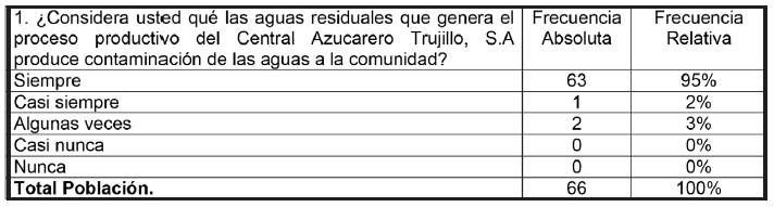Se evidencia que, un 95% de los encuestados consideran que las aguas residuales provenientes del Central Azucarero Trujillo, S.A son un agente contaminante para el agua de consumo humano en la comunidad, mientras el 2% piensa que casi siempre estas aguas producen contaminación y un 3% supone que algunas veces el agua de la comunidad es afectada.