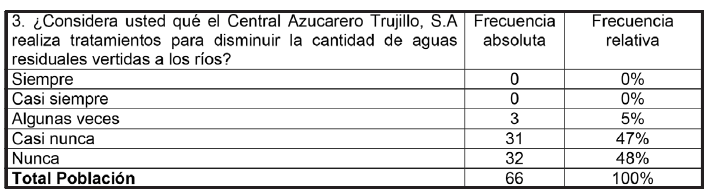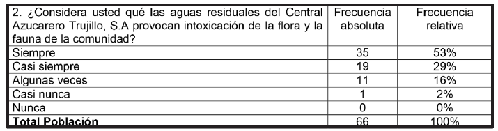 Tomando en cuenta los resultados obtenidos se puede decir que la población considera que la empresa no está realizando ningún tratamiento para controlar la cantidad de aguas residuales vertidas a los ríos, la comunidad expresa que estas aguas producen contaminación del agua y además están afectando su flora y su fauna; esto coincide con la percepción expresada en el gráfico 1 y 2 al considerar a las aguas residuales del Central Azucarero Trujillo, S.A como un agente contaminante.