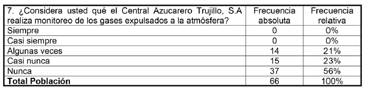 El 56% de los encuestados considera que nunca el Central Azucarero Trujillo, S.A ha realizado monitoreo de los gases expulsados a la atmósfera, de igual manera el 23% de la población opina que casi nunca son realizados estos monitoreos y un 21% de la población piensan que algunas veces el Central Azucarero Trujillo, S.A realiza monitoreos de los gases expulsados.