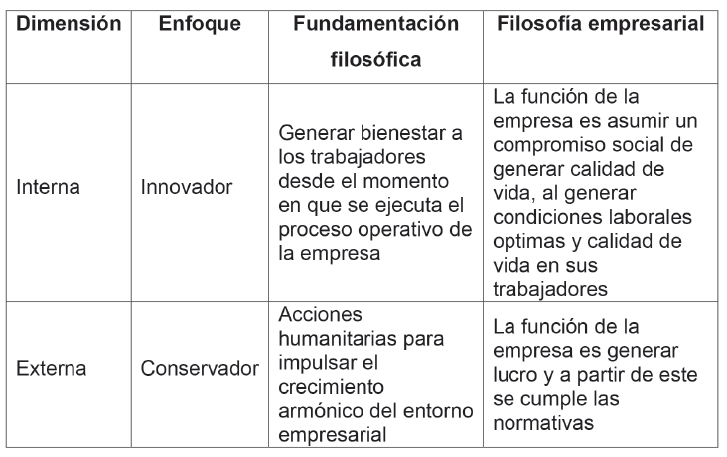 Con base en los planteamientos que anteceden, la RSE se fundamenta en la creación de una cultura contributiva de la empresa, que más allá del pensamiento filantrópico, desarrolla acciones de carácter sostenible y sustentable hacia dos dimensiones fundamentales; la interna, que involucra al personal que hace vida activa en la organización, quien con su esfuerzo realiza las actividades operativas de la entidad; y la externa, que engloba los agentes del entorno económico, productivo y social de la empresa, dentro de ellos se pueden identificar los inversionistas, proveedores, clientes, sociedad, ambiente y demás partícipes relacionados con la organización de una manera directa o indirecta.